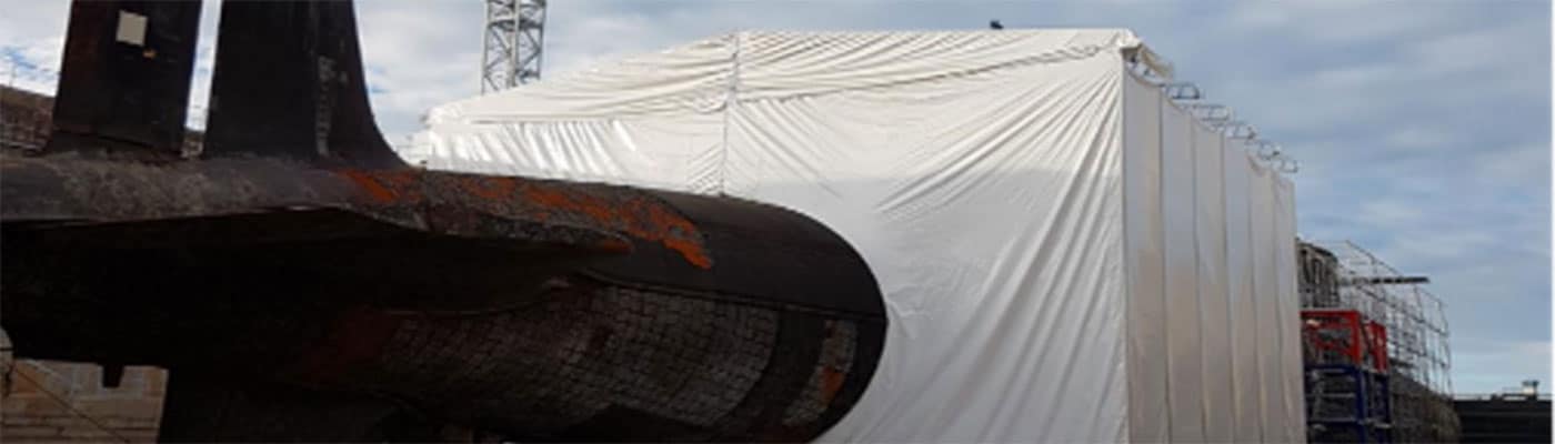 Installation of access systems (scaffolding) and containment measures (rail-mounted side tarpaulins + two thermo-welded plastic films) for asbestos removal and dismantling works.